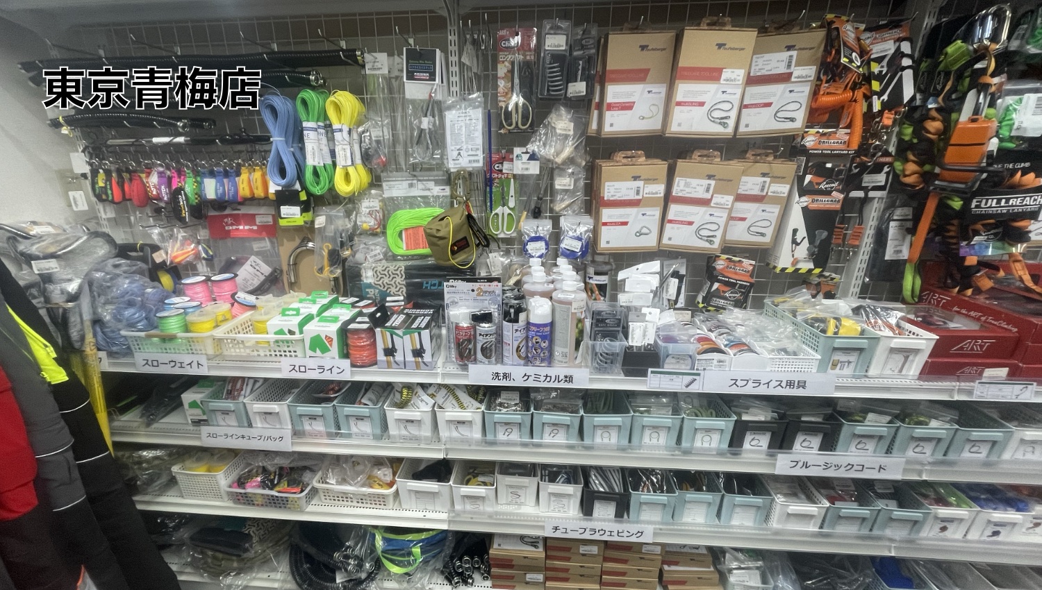 豊富な商品ラインナップと在庫数。実際に店舗で商品を試したり、クライミングの体験ができます。